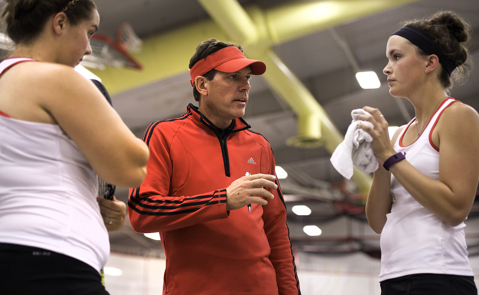 Dan Stumpf, head falcons women's tennis coach, consults with two of his players, Thursday, September 24 in Knowles when the team played against UW-Oshkosh. (Kathy Helgeson/UWRF Communications)