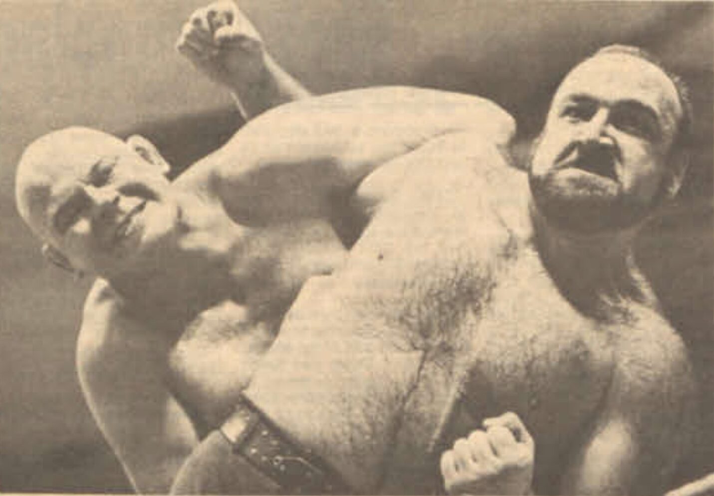 1976: Wrestlers Baron Von Raschke and Joe Leduc at All-Star wrestling match. (Photo by Randy Johnson)